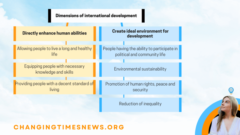 - Development — Longer‐term social and economic progress: enhancing human capabilities, infrastructure, governance; enabling conditions in which communities can thrive.