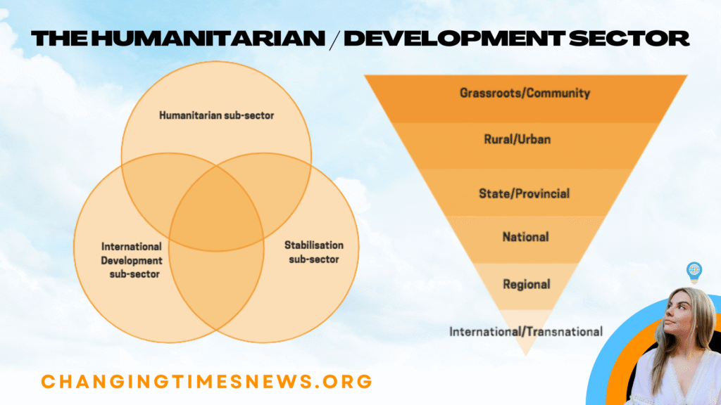 The episode explains that the humanitarian/development sector is not a monolith but rather comprises three overlapping subsectors: